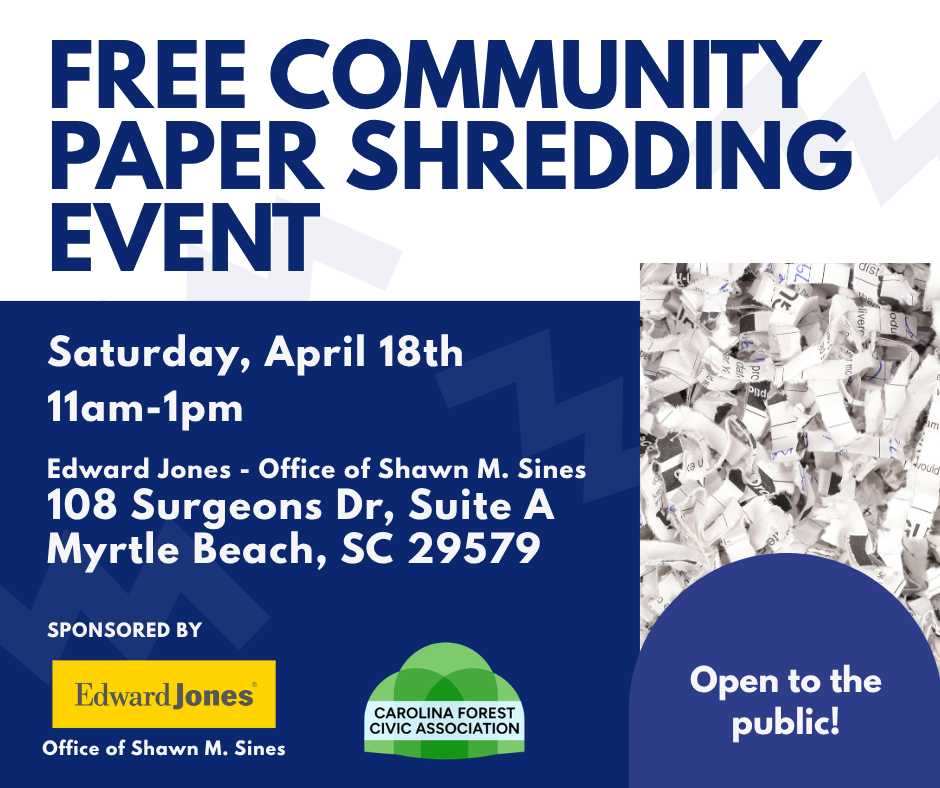 Be sure to mark your calendars for our FREE Community Paper Shredding Event THIS Saturday, sponsored by the Edward Jones Office of Shawn Sines!