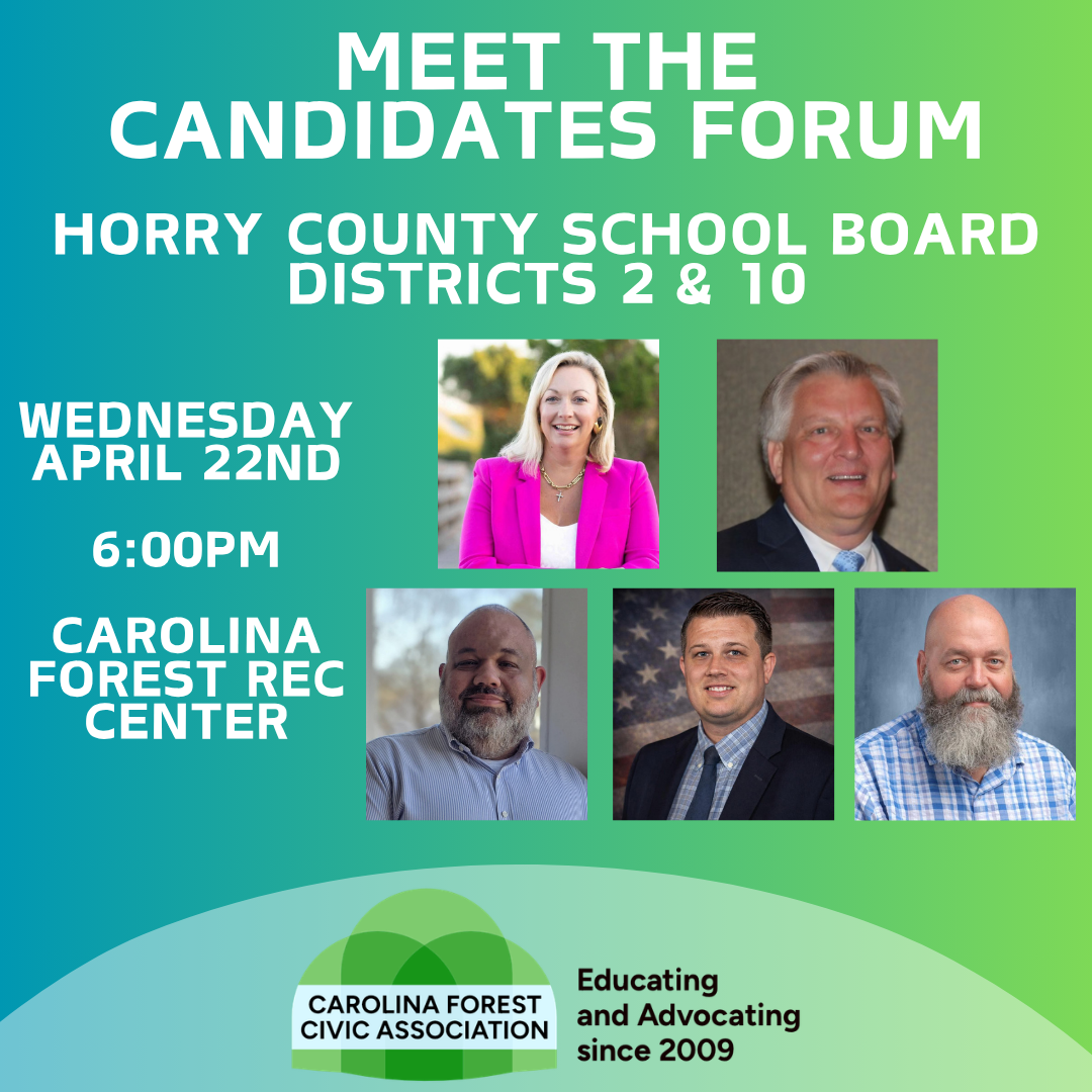 We are a non-profit 501-C-4 organization that endeavors to educate Carolina Forest residents on the issues that are important to them. We also create a voice for its residents throughout all levels of government to insure our voices are heard and the issues that are important to us are recognized by our legislators. Please join us in our attempts to make The Forest a wonderful place to live and work for the residents and businesses that call it home.
